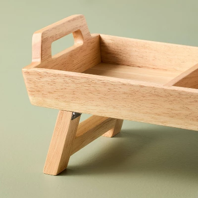 Serve a variety of items in one go with the Foldable Wood Serving Tray from Hearth & Hand™ with Magnolia. This brown serving tray comes with multiple divided compartments to give you ample space for your snacks, cheese and other items. Made of wood, this rectangle tray has folding legs for added convenience. Plus, it comes with side cut-out handles for convenient serving.