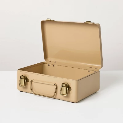 Evoke a sense of refined vintage charm with this Medium Metal Box with Brass Hardware from Hearth & Hand™ with Magnolia. Made of metal, this rectangular box is ideal for storing a variety of frequently used items. This lidded box is designed in a light brown hue and is accentuated with a center handle and two brass latch closures for a simple yet elegant look.