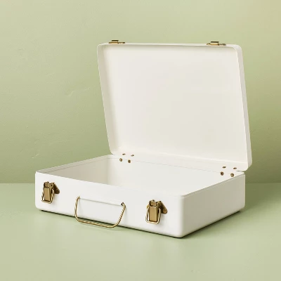Add stylish storage to your home with this Large Metal Box with Brass Hardware from Hearth & Hand™ with Magnolia. Made of metal, this rectangular box is ideal for storing a variety of everyday use items. This lidded box is designed in a sour cream hue and is accentuated with a center handle and two brass-finished latch closures for a simple yet elegant look.