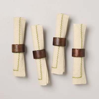 Prepare your table for a festive display with this 4-Piece Carved Edge Napkin Ring Set from Hearth & Hand™ with Magnolia. This set features four napkin rings crafted from wood, adding an earthy vibe. Featuring a carved design around the edges, these napkin rings are designed in a dark brown hue that enhances the appearance of your napkins. Versatile and easy to use, they are perfect for family gatherings or special occasions.