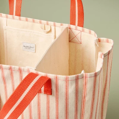 Shop conveniently with the Engineered Stripe Market Tote from Hearth & Hand™ with Magnolia. This tote bag features a striped pattern in orange and a natural shade for a beautiful look. It has an interior cell phone pocket and divided compartments to help keep the items separate. Made of canvas, this open-top tote bag has double handles allowing easy carrying.