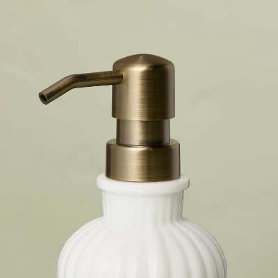 Give your bathroom essentials an elegant refresh with this Fluted Milk Glass Soap Pump from Hearth & Hand™ with Magnolia. Made from white milk glass with a fluted construction, this soap dispenser features an easy-to-use gold-tone pump that dispenses just the right amount each time. Suitable for use with gel soaps and lotions, it has a capacity of 10 ounces, and it can be spot cleaned or wiped clean for easy upkeep.