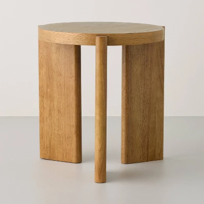 Elevate your home’s decor with this Natural Wood Accent Table from Hearth & Hand™ with Magnolia. This wooden accent table features a 16-inch round tabletop, allowing you to hold drinks, phones, or a table lamp easily. It stands at a height of 18 inches atop a trio of wooden, slab-style legs, blending effortlessly with any decor style due to its natural light brown finish. Place it beside your couch or armchair for functional use with flair.