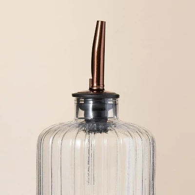 This Oil & Vinegar Ribbed Glass Bottle Set with Wood Base from Hearth & Hand™ with Magnolia is a great way to add flavor to your creations. Placed on a wooden base, it includes two glass bottles with a ribbed design to add a decorative look to your kitchen counter or tabletop. The airtight leakproof seals help to keep stored contents fresh, while the narrow easy-pour spouts provide mess-free dispensing.