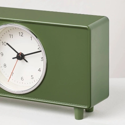 Keep track of the time while managing tasks with this Table Clock Green from Hearth & Hand™ with Magnolia. It features a round analog clock in chrome finish and boasts an off-white clock face for clear visibility. Made of metal, the clock features a green hue and has four legs for easy placement on a table, bookshelf, or mantel.